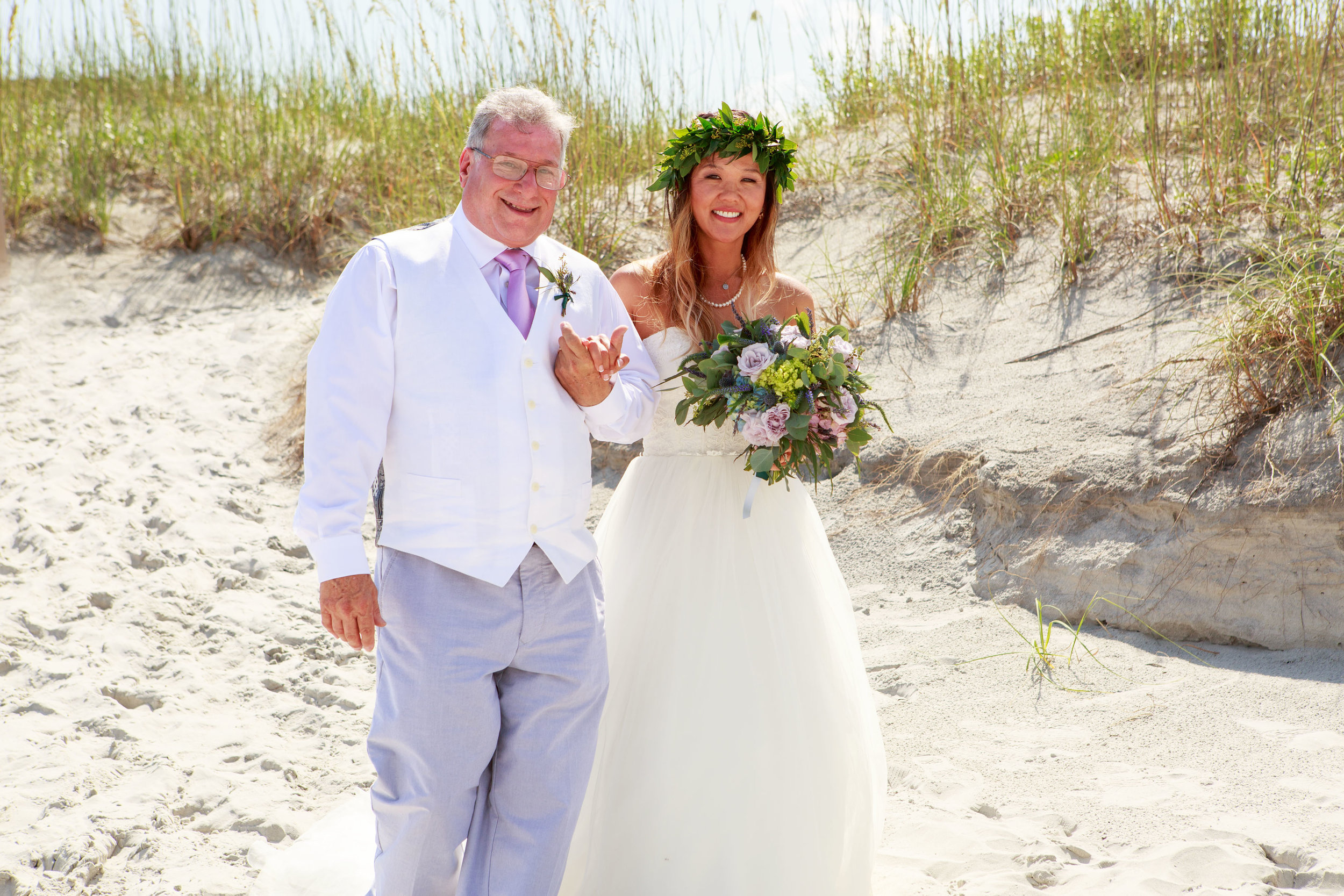 The ceremony was one for the books and took place at the couple's absolute favorite beach spot on Wrightsville Beach. How beautiful is the tree covered walkway to the ceremony location and I am loving the flower girls' floral crowns by Design Perfection of Wilmington!